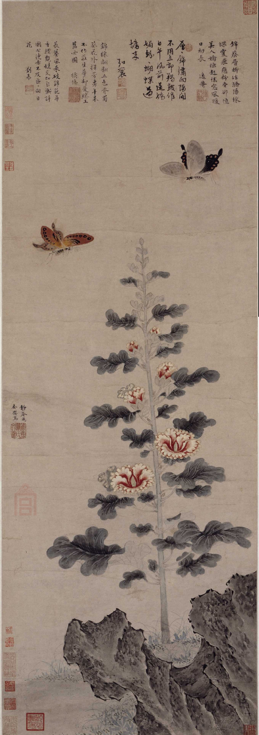 葵石蛱蝶图 轴 明 戴进绘 纸本 设色 纵115cm 横39.6cm 款署:“静庵为奎斋写。”钤“钱塘戴氏文进”印。画幅上方有明刘泰等四家题跋。鉴藏印钤“朱之赤”等。