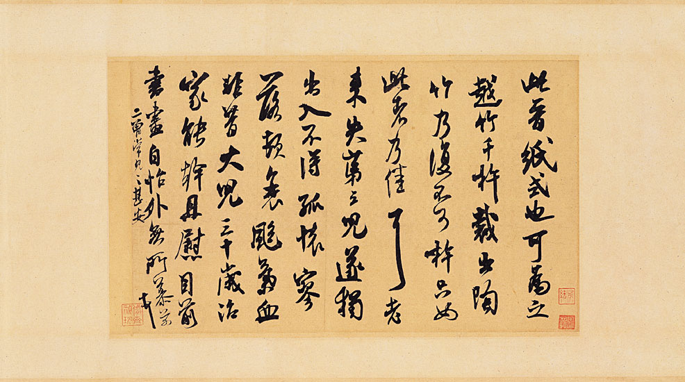 此晉紙式也。可為之。越竹千杵裁出。陶竹乃復不可杵。只如此者乃佳耳。老來失第三兒。遂獨出入不得。孤懷寥落。頓衰颼。氣血非昔。大兒三十歲。治家能幹。且慰目前。書畫自怡。外無所慕。二曾常見之甚安。芾頓首。