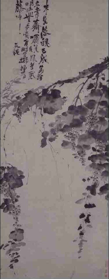 本幅自题:“半生落魄已成翁,独立书斋啸晚风。笔底明珠无处卖,闲抛闲掷野藤中。天池。”钤“湘管斋”印。鉴藏印有:“竹朋真赏”、“陈希濂印”、“北平韩德寿审定真迹印”、“夏山楼藏书画记”、“毂水过眼”。