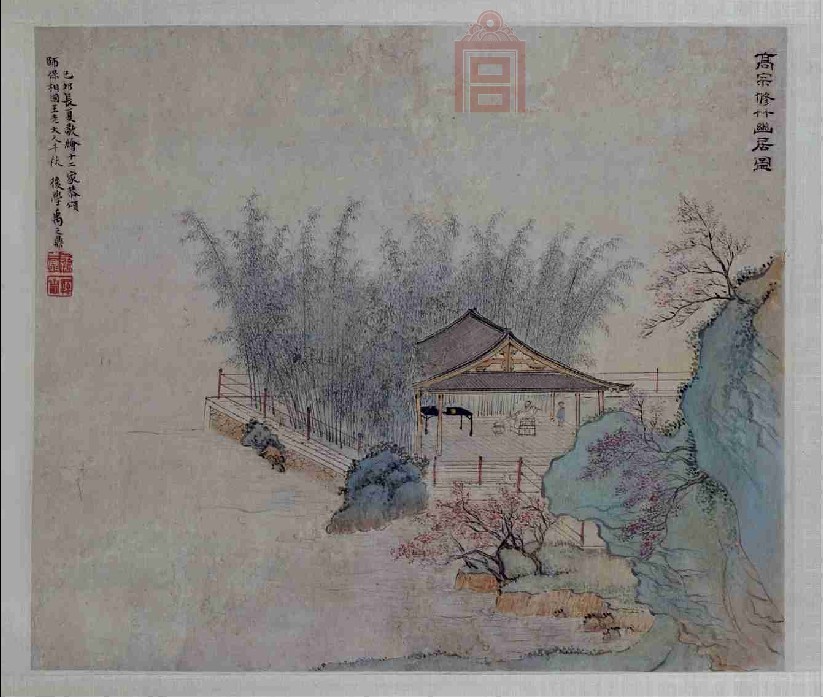 本幅左上题“高宗修竹幽居图”,右上款署:“师保相国王老大人千秋,后学禹之鼎己卯长夏敬绘,十二家恭颂。”钤“禹之鼎”、“慎斋”印二方。己卯为清康熙三十八年(1699年),禹之鼎时年53岁。