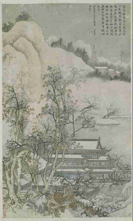 本幅自题:“乾隆四十二年十一月臣谢遂敕恭仿宋人寒林楼观图。”钤“臣”、“遂”印2方。另有董诰录乾隆皇帝《御制题宋人寒林楼观图诗》:“层叠楼台惨淡林,高低一例积瑶琳。富家置酒暖烘座,赴客骑骢雪洒襟。劳逸眼前如说偈,精神笔外自标吟。李成品格犹北宋,疎宕漫从四氏寻。”
