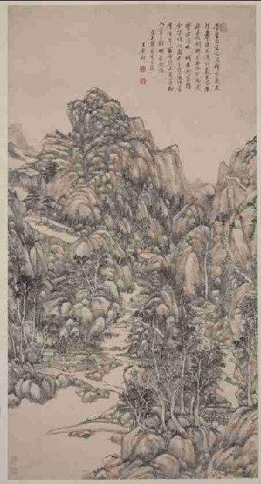 王原祁(1642年-1715年)〔清〕字茂京,号麓台、石师道人,江苏太仓人,王时敏孙。康熙九年(1670年)进士,官至户部侍郎,人称王司农。以画供奉内廷,康熙四十四年奉旨与孙岳颁、宋骏业等编《佩文斋书画谱》,五十六年主持绘《万寿盛典图》为康熙帝祝寿。擅画山水,继承家法,学元四家,以黄公望为宗,喜用干笔焦墨,层层皴擦,用笔沉着,自称笔端有金刚杵。主张好画当在不生不熟之间,自出心裁,不受古法拘束,熟不甜,生不涩,淡而厚,实而清,书卷之气盎然纸墨外。