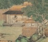 这幅美丽的青绿山水画是乾隆爷收藏的,现存于旅顺博物馆。它是清代画家上睿和尚画的。画得传统浅绛山水的题材携琴访友图。画的人物惟妙惟肖,我很喜欢。有明末文人山水的味道。该画落的款是浦室子睿。此画一溪横贯,水榭幽轩隔岸斜对,中有板桥,一老者及携琴随童,过桥去访幽居之友。构图简洁,境界开阔。景物聚散合度,虚实相生,人物虽小而刻划入微,引人注目。笔致松秀,色调清新。 自题“癸酉小春用文太史笔意,为友桐先生补图,蒲室子睿。”癸酉为康熙三十二年(1 693),时年60岁。文太守指的是访明代文徵明风格笔意作的此画。