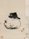 朱耷(1626-1705),清代画家。僧人。原名统。江西南昌人,明宗室后裔,明亡后出家,一生字、号、别号极多,主要有:法名传棨,号雪个、个山、屋驴、人屋,尤以八大山人最为知名。据载,他还曾弃僧入道,改名朱道朗,字良月。在书画上亦有许多画押,如“三月十九日”、“相如吃”、“拾得”、“何园”等,含义较深。另外他署款时常将“八大山人”连缀写成“哭之”、“笑之”字样,以寄托愤懑。作为明宗室后裔,朱耷身遭国亡家破之痛,一生不与清王朝合作。他性情孤傲倔强,行为狂怪,以诗书画发泄其悲愤抑郁之情。
