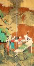 此件作品,画家取传统吉祥寓意,作人物画。名曰:加官进爵。图中,一古装官人端坐于席,身后一迭衣服上放置一“冠”,“冠”与“官”谐音,加冠是指加官之意。前面有一人双手高举青铜爵杯过头,意味高高进爵。“爵”乃古代饮酒的器具,寓爵位连连高升。画中人物以钉头鼠尾描写出,周围山石树木皆以淡笔皴擦,整幅画设色淡雅,人物情怀高古,寓意吉祥。