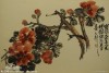 斑斓秋色雁初飞,浅碧深红映落晖。《秋色斓斑》画老来红,用色饱满浑厚,与墨之古朴苍率相互映发。顶叶一丛更猩红如染,鲜艳异常,宋人杨万里谓其“借叶为葩”,“叶从秋后变,色向晚来红”,人们称之“老来红”。《群芳谱》说:“红、紫、黄、绿相间者名锦西风……以长竹抉之,可以过墙,甚壮秋色。”吴昌硕借画中秋色,寄托自己“秋色斓斑”的心境。