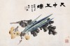 此作六皆拓片,赵之谦补花卉,所拓为商代晚期古鼎。六皆是咸丰同治年间杭州著名的吉金拓家,赵之谦的朋友。此作款曰“同治八年九月之谦为练溪五兄同年补花果两种。”同治八年即1869年,当时赵之谦正从北京南归客居杭州,故此画作于杭州。“练溪”胡姓,也是赵之谦的朋友。在拓片上作画,既不能压抑所拓器物,也不能掩饰自己的表现。赵之谦就擅长张扬个性。而在古鼎拓片上作画,他非但落笔不滞疑,且无一笔误,将花卉果枝从古鼎中生发,透视一律,盎然有生气。果实大小疏密,花枝长短错落,乃至设色浓淡素艳,不仅顾及了古鼎的器型,也顾及了鼎身的纹饰,相互映带,和谐统一。赵之谦属于那种眼既高手亦高的艺术家,其绘画不受媒材和形式限制。