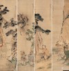 图中耸立两株青松,虬枝盘折,古藤披垂,气势非凡。松下湖石峻峭,芍药盛开。此图似是取意韩魏公邀客品赏芍药名品——金带之轶事。据说“此花开者,城中必出宰相”,后果如此言,品赏此花的人,后皆入相。此画用笔工整,以铁线描写衣纹,人物神态各异,均有生意。色彩古雅,韵味高远。
