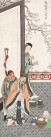 可见他这一类风格仕女作品,是多么的受到大众的欢迎。在仕女画之外,他也发展出一种属于年画式的吉祥富贵图。例如作于光绪17年辛卯(1891)他37岁时的《晋爵图》设色纸本立轴,可作为这个阶段的代表。在这一个时期,他喜画一种大幅通俗人物画,专画麻姑寿星、加官晋爵等吉祥如意的题材,笔法简练有力,造型气势开阔,气质高贵文雅,设色富丽明快,在华洋杂处的上海滩,广受一般市民的喜爱。此后他的人物画上,题诗渐少,大约是因为作品一经畅销,笔下必须快捷,构图设色已是费力耗时,诗思情意也就无暇顾及了。
