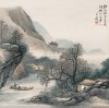 此图写夕阳斜曛,老汉骑驴过桥而归,童子挑担相随;桥下溪旁,渔翁戴笠侧身于船上,作扭首闲眺状。柴篱村舍错落于远近山坳,无处寺廊塔影隐隐可见。山顶梵宫屋宇巍峨。秋山夕照,归鸦点点,诗意尽在画图国。气势雄厚,丘壑幽奇,水墨晕染,烟云生动。画家擅长米芾、高克薛两家的画法。人物线条细腻,落笔潇洒,具有晚清上海画派的风格。自题云:“看山人坐夕阳船,董两家笔法,甲寅小阳月,白下吴石仙。”是他晚年所作。