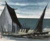 纸本彩墨《渔舟》:孤零零泊于岸边的渔舟上的渔人背影、临水而立的渔鹰、远处的几抹烟岚使人顿生寂寞、凄凉、哀怨之感。林风眠不厌其烦地反复画这类带着悲剧审美情趣的题材以浇胸中块垒,并使人觉得疲惫受伤的灵魂可以在其中歇息。这和他坎坷的人生经历有关。