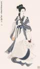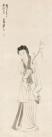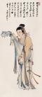 张大千在四十年代初从敦煌归来之后,画了许多别具面目的仕女画。此图即是1946年早春画赠其学生侯碧漪的。画以白描法勾勒而出,线条细劲畅达,宛若细丝游鸿,不着朱彩,已是神采飞扬,仕女形象娴静娟好,一手举折枝,似若有所思,用笔轻灵飘逸,是他仕女画成熟期的典范之作。此画以皮纸作画,故显得入木三分。