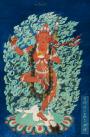 “蜀郡清信士张大千敬造”的这幅女性神祇画像,依画面上方的藏文题记可知,为“金刚亥母”。之所以称“亥”,是因为她头侧长有猪首,猪属亥,在藏传佛教中,猪被喻为“痴、贪、嗔”三毒中的“痴”,金刚亥母即是消除痴毒、勾召智慧之象征。金刚亥母是空乐之根本,也是成就一切之源,属于空行母主尊,为藏密噶举派主修空行。空行母的字面解释即为“穿越天际者”,这也象征性地表明了,这是一个沉浸在空性体验中的神祇。狭义而言,空行母为护持密乘行人及教法之女性护法,亦是对一切修密乘的女性之尊称,广义而言,女性之佛陀皆为空行母。故张大千绘制的本幅画像题签作“西藏空行母”。作为已获得成就,教法护法或圆满智慧女神的空行母,通常被画成裸体舞姿状,观本幅画像:一面二臂,身红色,头戴五骷髅冠,有三只眼,表示能观照过去、现在和未来。左臂弯里架有一根天杖,左手拿嘎布拉碗,右手持钺刀,颈挂五十人头花环,身佩珠链,右足悬空,左足踏一人尸于莲花日轮座,象征战胜魔障,身后有般若烈焰。从佛教艺术的角度来看,值得注意的是空行母画像不少都是怒目圆睁,面目狰狞,而张大千所绘本幅空行母之容颜却好似唐代敦煌壁画中的佛像一般,亲切感人,其内蕴珍贵秘密佛理奥义。张氏所绘不仅是一幅佛画,更是一种观想的意境,凡夫心不净,故呈现杂染纷乱的意识流。若将杂染不净的念,转化为本尊身相的清净观,是心即是佛心。如此,大千此作就不只是一幅画,而是一种修法的观想所依。