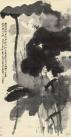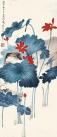 此乃大千先生八十四岁高龄之作,这帧荷花不同于他生平以华丽奔放见长的荷花诸作,而以纯美清雅胜出,大有繁华落尽、洗尽铅华的感觉。画中两朵荷花,一花一苞,一开一合;几片荷叶,高低错落,翻滚延展;绿的迷蒙氤氲托出红的高洁出尘。尽管花红叶绿,摇曳多姿,一派夏日荷塘的烂漫色调,却经过清墨淡晕,反而有一种沉潜宁静的底蕴。在笔墨上,张大千回归徐崇嗣没骨花卉传统,花茎清晰瘦长,不蔓不枝;荷花粉嫩出尘,香远益清;荷叶草草,墨晕流动而平衡,衬托出出莲花亭亭净直的品质。整幅作品用色清雅,运笔灵活。位置经营得跌宕起伏却又平衡有致。
