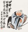 齐白石的人物画,乃是画种之创格,逸笔草草而神情必现,又往往辅之以题款及诗句。谐谑相杂,讽世之余,一唱三叹,其文字与写意之人物互相辉映。往往言有尽而意无穷。白石之人物画创作乃为草虫山水之外存世最少者,素为藏家所珍重。《醉翁图》白石曾画有数稿,此幅自题为“白石自更旧造稿”,当是在旧作上又加以提炼概括,用笔更加恣肆,形象更为简括。白石将毕卓好酒的典故改造成此图的故事新编。魏晋之际,文人清谈与好饮之风盛极一时,成为传诵后世魏晋名流之典型,如刘伶之好饮,阮籍之贪杯,均为后世文人所传唱不绝。毕卓为晋人,任职吏部,亦以贪杯荒废职守。白石将在职之纵酒改造为致仕之贪杯。