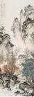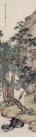 绵延的群山之中,雾气弥漫在树梢,溪水自山之深处缓缓地流出,枝叶婆娑的树下,两位士人临溪而坐,谈论古今,这是一幅令中国历代知识分子所向往的桃花源图景,是一个隐居避世的天堂。陈少梅的笔法也将这种理想的风景表现得淋漓尽致。画中远景的山石运用斧劈皴和点苔表现出坚硬和湿润的质感,画面左下部用缭绕的云气和蜿蜒的溪流表现出山中的虚静之致,右下部的两棵大树写得很精彩,树干细长虬曲,树枝缤纷摇曳,淡蓝色点出的树叶打破了树枝写法的细谨,也使树的气质与整幅画的清雅格调相契合。两位士人宽袍大氅,气定神闲,颇有林下之风,仿佛已与山林“天人合一”。整幅笔法劲健清爽,境界空灵渺远,既得北派山水画的骨力,又得南派山水画的风韵,是画家精研古法又出自机杼的佳作。