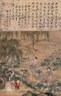 此图描绘农村田头,老翁、幼童、少年、农夫,正静听一盲人在大树下说唱,引得隔溪老妪农妇抱婴携童指手欲趋。唱者喜笑颜开,听者神情各异,富于农村生活情趣。画法精工兼写,注重人物形象刻画,生动自然;衣纹线条类钉头鼠尾,挺拔流畅。