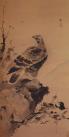 图绘一只苍鹰独立岩顶,两只飞舞的蜜蜂吸引了它的目光,一旁的喜鹊趁机振翅欲逃。作者用笔粗阔,富有简率纵逸的笔墨意趣。吕纪的花鸟画不仅追求形似,更善于表现禽鸟之间的关系,捕捉住禽鸟瞬间的神态和动势,营造出千钧一发的紧迫感和爆发力,突破了传统花鸟画唯美的装饰意味,从而获得了新的艺术生命力。