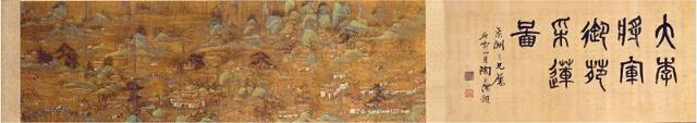 此卷为吴景洲先生于1947年“倾囊得之”,1955年捐献故宫博物院,卷后有其长题,考定此卷 为张丑《清河书画舫》中著录的“唐大李将军御苑采莲图”。后经有关学者考证,此卷为南宋 人作,虽非出自李思训父子之手,但仍反映出早期青绿楼阁绘画的一些特点。