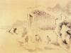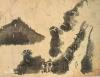 山水图之二。此图山石以战笔勾勒,略加皴擦点染, 巨石如拳,石壁回转,成开合之势,阴阳向背,极富立体感。三人坐石坡上共饮,谈笑风生,形体夸张而生动传神。远山淡墨轻抹,水光云影交辉。画面上单线与块面,淡墨渍染与浓墨点苔,笔墨极富情趣,尤一留白粗处,最堪品味。