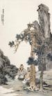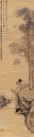 任熊笔墨高古,绘人物由明季陈老莲入手,风度直接唐人,奇瑰倩丽,叹为绝手,若天假以年,任伯年氏恐不敢专美,盖其才气天份极高。此幅乃以老莲法入画,人物开相纯以变形,衣饰布置,极具装饰性。
