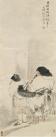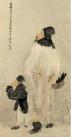 本幅以“雪中送炭”为题.取材自民间市井之仗义行为,这是百姓理想中所推许待人处世的态度,伯年出身民间,知之甚透彻,故写来得心应手,简洁洗炼,微妙传神,无丝毫扭捏造作之态!画中隐去漫天飘雪或坚冰凝地,只见一老一少,结伴而行,戴帽,仅露半脸,披厚衣,身形略呈臃肿,由此可知乃身处严冬时节,非厚重衣物不能御寒。小童一手凑近嘴巴,似是靠呵气以驱冻。画家凭藉细节的描绘,营造了严寒肃杀的气氛,却无一笔刻划冰雪,这种曲笔处理,极见其构思之巧妙。他以简驭繁,却无损局部细密之描写,如小童一腿具细绳以束系布靴,另一腿则阙如,细慎处,反映了送炭者的经济状况亦非大富之家。这无疑是“仗义每多屠狗辈”之写照矣!全画以淡墨写成,淡蓝浅朱稍一点染,即生提醒之效,而线条运用甚简,起落顿伏,寥寥几笔即交待了两人的身躯体态,形神俱精妙入微。