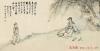 此选上官周《人物故事图》册八帧中的二帧,之一为《庐山观莲》,描绘东晋僧人慧远于庐山结白莲社,与当时高僧贤士、社会名流交往的故事。图中文人,丰颐长髯,左手执如意端坐观莲,当为谢灵运。右一僧人坐蒲团作展读状,当为慧远。左画二僧,一老僧观莲,一幼僧提壶肩杖侍立。画风谨细,设色明快淡雅。灵运有文士风度,衣纹亦流畅自如。僧人衣褶多为行云流水描,有装饰性。左上题云:"庐山远公开池种白莲,以十八人为社,社中陶渊明、谢灵运,一因无酒不至,一好游而长来。"可见图中人物主要应是谢灵运、慧远。四人神态各异,而无不细致生动,十分传神。